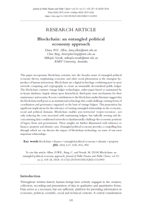 Abstract: This paper incorporates blockchain activities into the broader remit of entangled political economy theory, emphasising economic and other social phenomena as the emergent by-product of human interactions. Blockchains are a digital technology combining peer-to-peer network computing and cryptography to create an immutable decentralised public ledger. The blockchain contrasts vintage ledger technologies, either paper-based or maintained by in-house databases, largely reliant upon hierarchical, third-party trust mechanisms for their maintenance and security. Recent contributions to the blockchain studies literature suggest that the blockchain itself poses as an institutional technology that could challenge existing forms of coordination and governance organised on the basis of vintage ledgers. This proposition has significant implications for the relevance of existing entangled relationships in the economic, social and political domains. Blockchain enables non-territorial ‘crypto-secession’, not only reducing the costs associated with maintaining ledgers, but radically revising and deconcentrating data-conditioned networks to fundamentally challenge the economic positions of legacy firms and governments. These insights are further illuminated with reference to finance, property and identity cases. Entangled political economy provides a compelling lens through which we can discern the impact of blockchain technology on some of our most important relationships.